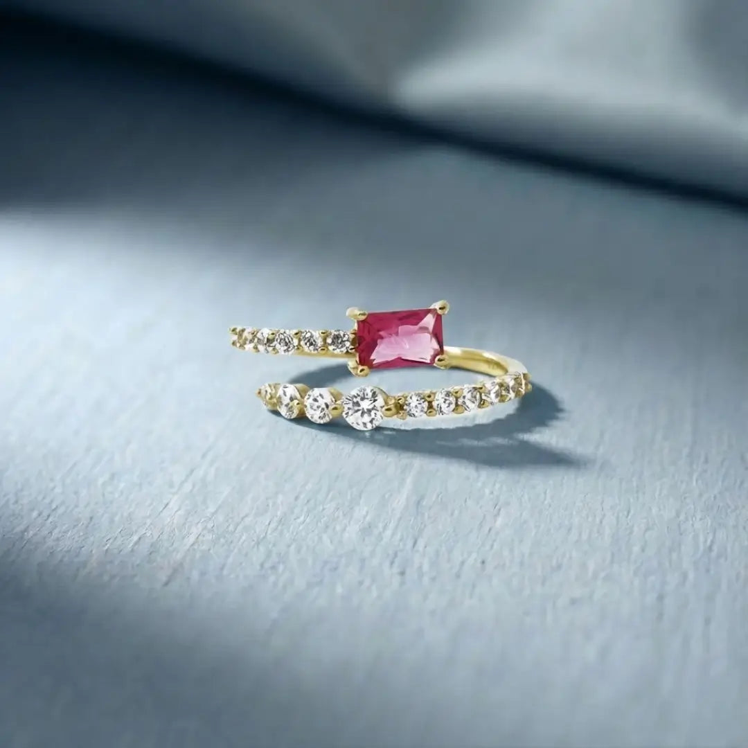 The Ruby Fan Accent Ring is a luxurious and elegant statement piece. Featuring a dazzling ruby-hued stone at its center, surrounded by a gracefully flared fan design accented with brilliant sparkle, this ring offers a bold yet sophisticated glamour. It is the perfect accessory for special occasions, adding a vibrant and captivating touch to any ensemble.