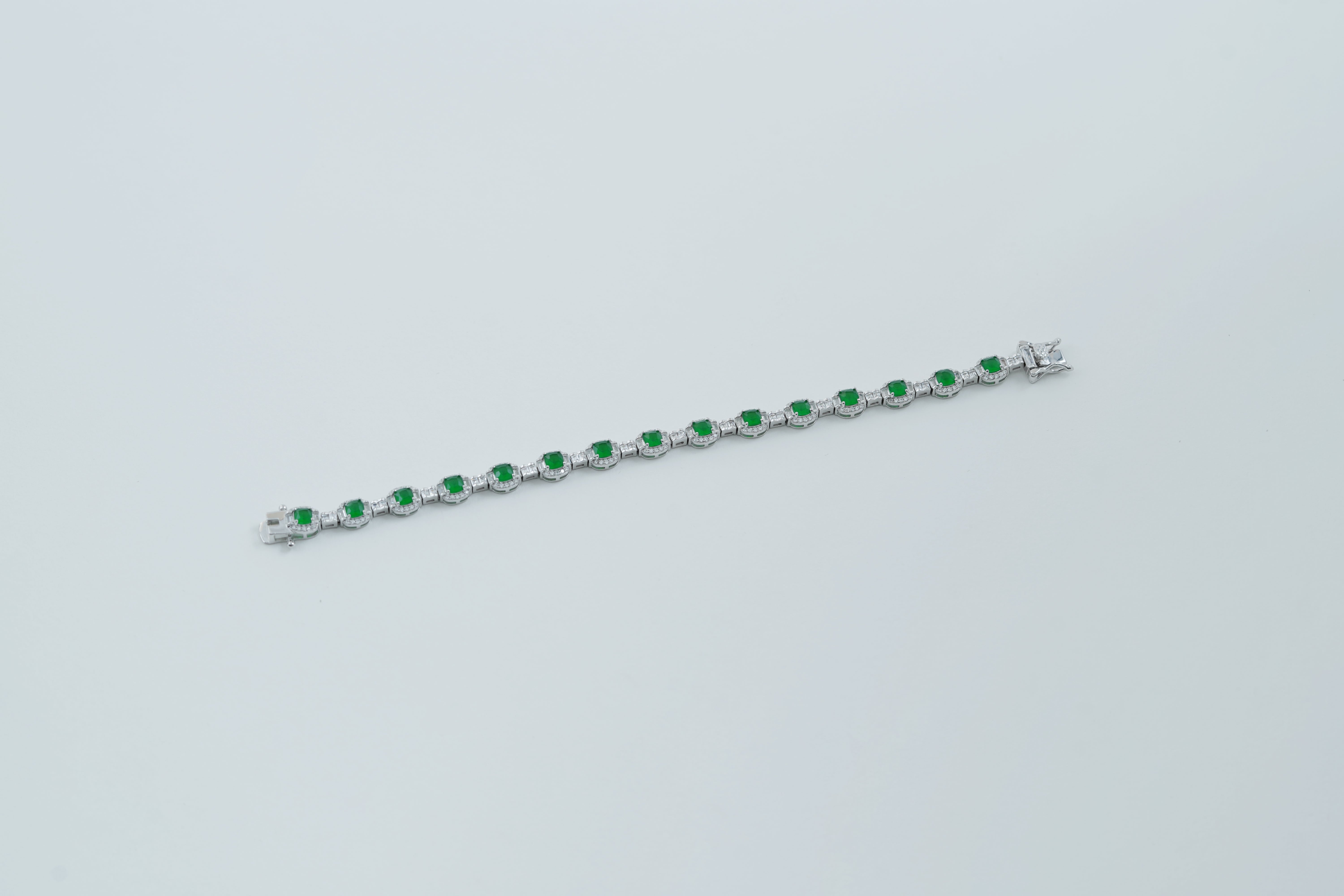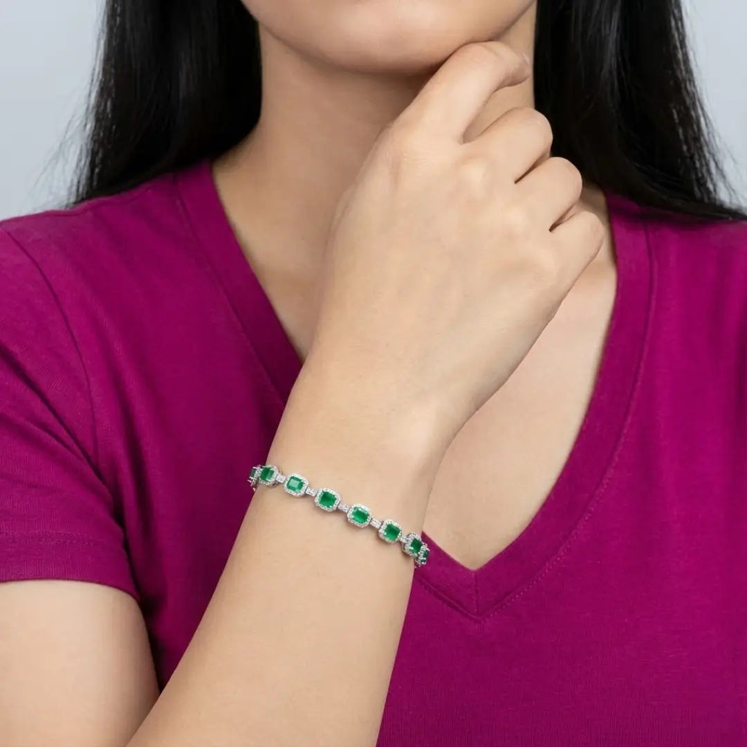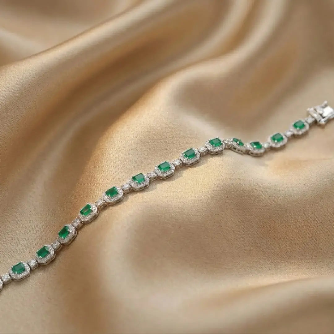 The Silver Emerald-Green Halo Tennis Bracelet is a captivating piece that brings together classic elegance with a vibrant pop of color. It features stunning emerald-green stones, each encircled by a brilliant silver halo, creating a continuous line of sparkle. This bracelet is a sophisticated accessory, perfect for adding a luxurious touch to any ensemble.