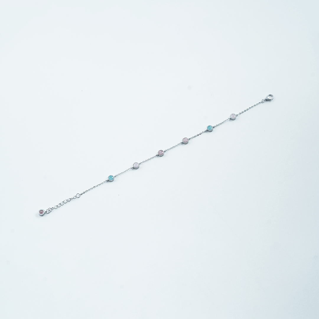The Silver Pastel Trio Bezel Bracelet is a delicate and charming accessory, perfect for adding a touch of soft color to any look. It features three sparkling pastel stones, each elegantly set in a bezel, connected along a slender silver chain. This bracelet is designed for effortless everyday wear and offers subtle sophistication.