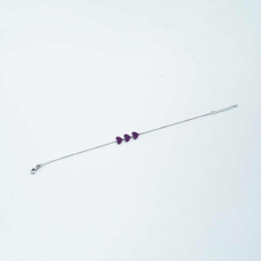 The Silver Triple Pink Heart Bracelet is a sweet and charming accessory, perfect for expressing affection. This delicate bracelet features three beautifully crafted pink heart charms, adding a touch of feminine grace and subtle sparkle to any wrist. It's an ideal piece for gifting or adding a whimsical element to your everyday style.